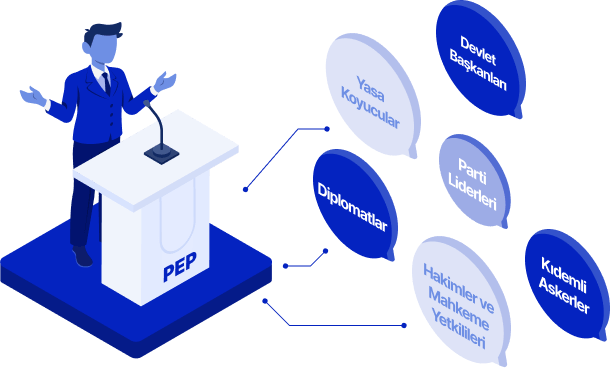 PEP (Politically Exposed Person), üst düzey kamu görevi yürüten veya geçmişte yürütmüş olan kişilerdir. Devlet başkanları, bakanlar, yüksek yargı mensupları, üst düzey askeri yetkililer ve devlete ait şirketlerin yöneticileri bu kategoriye girer. Bu kişiler ve yakın çevreleri (RCA), potansiyel yolsuzluk ve rüşvet riski nedeniyle daha sıkı bir incelemeye tabi tutulur.